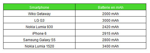 En revanche si vous utilisez votre smartphone tout autant pour les jeux, les applications ou la navigation internet, peu de smartphones supporteront toute une journée cette utilisation intensive. La solution ? Dirigez-vous vers des appareils ayant une batterie de plus de 2000 mAh. Fort heureusement, les standards actuels font que la plupart des fabricants optent automatiquement pour des batteries de plus en plus efficaces, comme le démontre le tableau suivant :